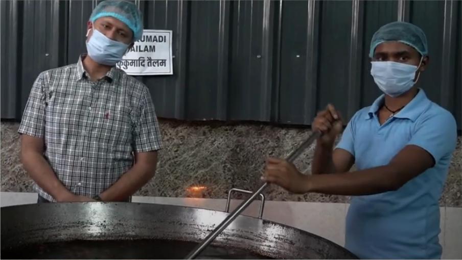 Rudraksha in the logo, consecrated temple, daily chants, and prayerful approach to production